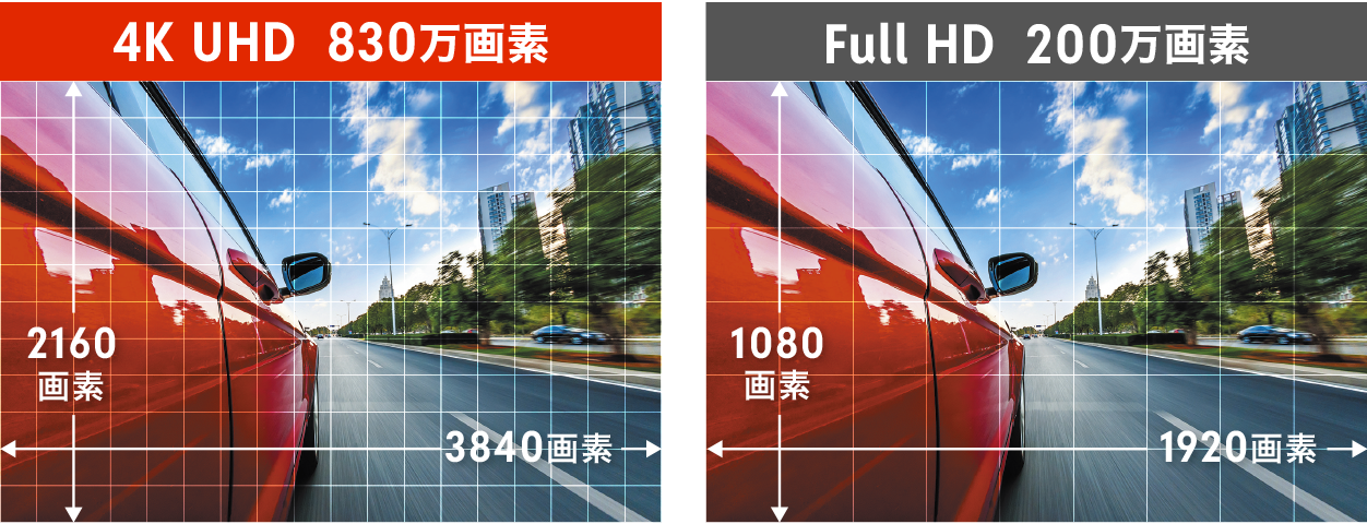 前方車両のナンバープレートや標識、周囲の状況などをFull HD記録モデルよりも鮮明に記録します。