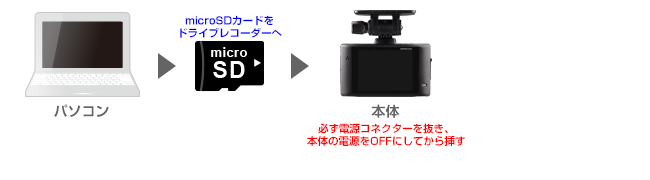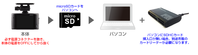 | 3. | 電源OFFの状態のドライブレコーダーからmicroSDカードを抜きパソコンに接続します。 ※パソコンにmicroSDカードの挿込口がない場合は別途カードリーダーが必要になります。 |