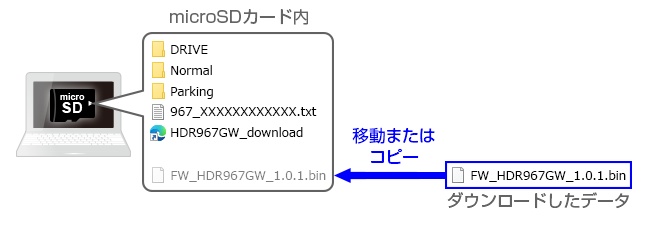| 4. | パソコンでmicroSDカードを開き、ダウンロードした『FW_HDR967GW_1.0.1.bin』というファイルを、microSDカードの直下に移動またはコピーします。 | ||||||||||||||||||||||||